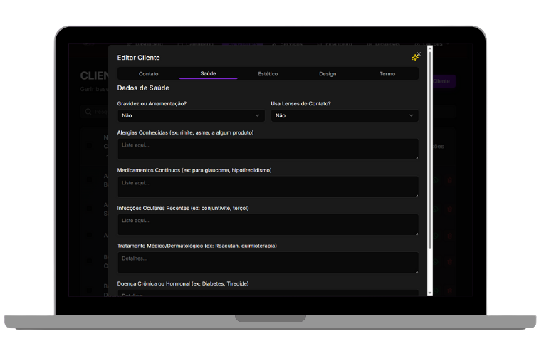 Sim! A nossa Ficha Digital é completa e serve como um prontuário de saúde e estética da cliente. Você pode usá-la para Extensão de Cílios, Lash Lifting, Brow Lamination e Design de Sobrancelhas. A cliente assina direto na tela do seu celular ou tablet.